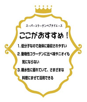 コラーゲンペプチド コラーゲンを酵素処理で分解し低分子化したもの食品として摂取した場合、体内でアミノ酸に分解しやすく吸収性が高い。