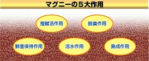 マグにーは、今注目されている数々の薬石・岩石類(トルマリン石等を含む)やセラミック類より比較にならない程強力なパワーを有する電磁波・育成光線を放射します。酸化反応を防ぎ酸化した物質をもとに戻す力=還元反応の高い良質の水を作り出すことから、活性酸素を抑制する働きも期待できます。